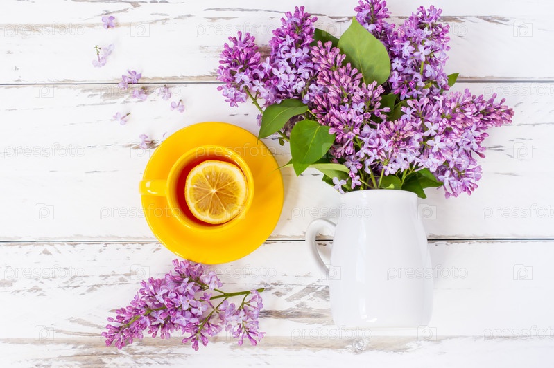 Креативная весенняя композиция. вид сверху на желтую чашку с чаем и кувшин с букетом фиолетовой сирени. чашка стоит, кувшин лежит