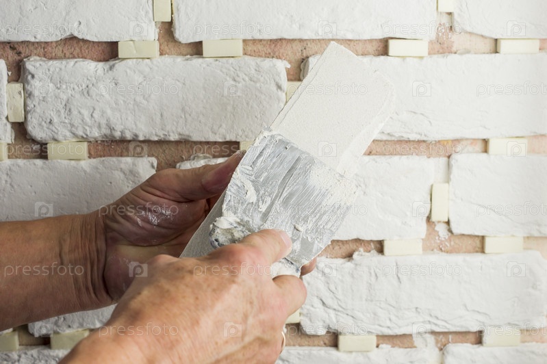 Мастер наносит клеевой раствор шпателем на декоративную плитку. концепция отделочных работ
