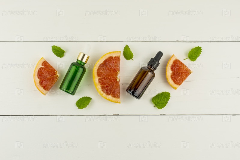 Вид сверху на две косметические фляги с пипеткой органического грейпфрутового масла на белом деревянном фоне. кусочки фруктов, листья мелиссы