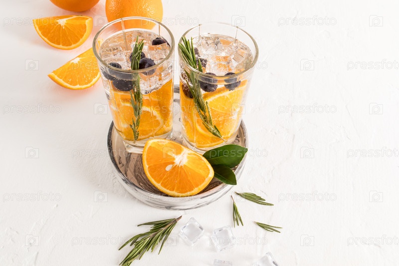 Два стакана витаминной воды с дольками апельсина, черникой, веточкой малины, кубиками льда на белом столе. освежающий напиток