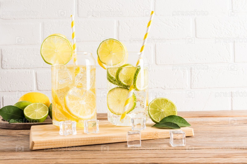Два стакана с освежающим напитком, коктейль или тоник с лимоном и лаймом, кубики льда на деревянном столике напротив стены из белого кирпича