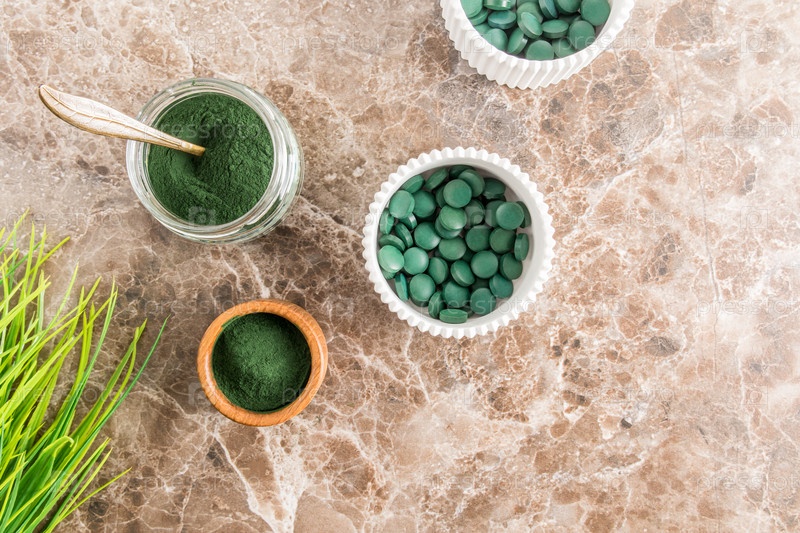 Вид сверху на стеклянные банки с зелеными таблетками суперпродукта спирулины и порошком на мраморном столе. альтернатива медицине