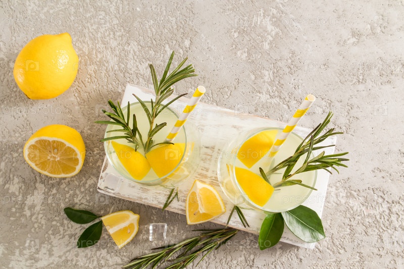 Два стакана домашнего лимонада на деревянной белой доске и бетонном столе. полезный напиток без добавок и красителей