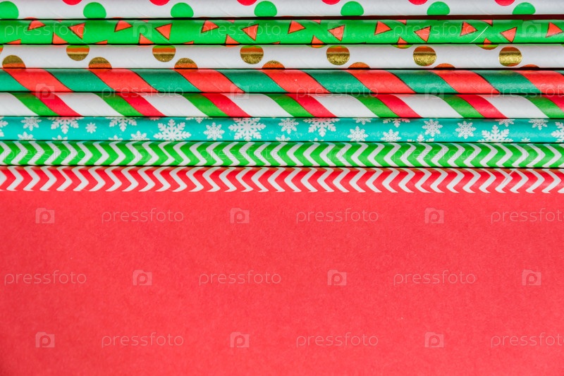 Новогодний рождественский фон. Празднование коктейльной вечеринки соломкой на красном фоне. Шаблон оформления текста поздравительной открытки