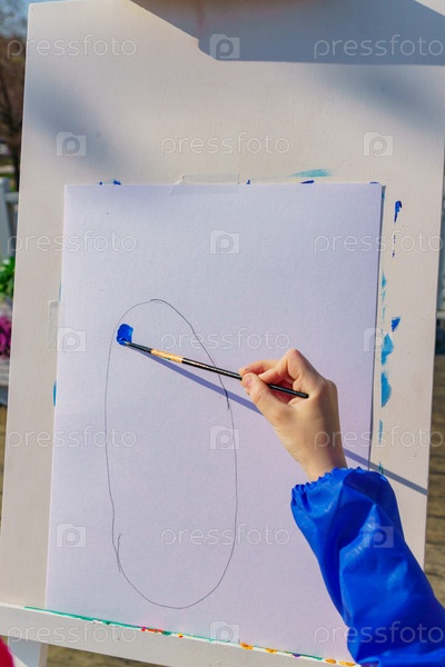 Рабочее место художника. Малыш рисует синей гуашью картинку. Мастерская под открытым небом