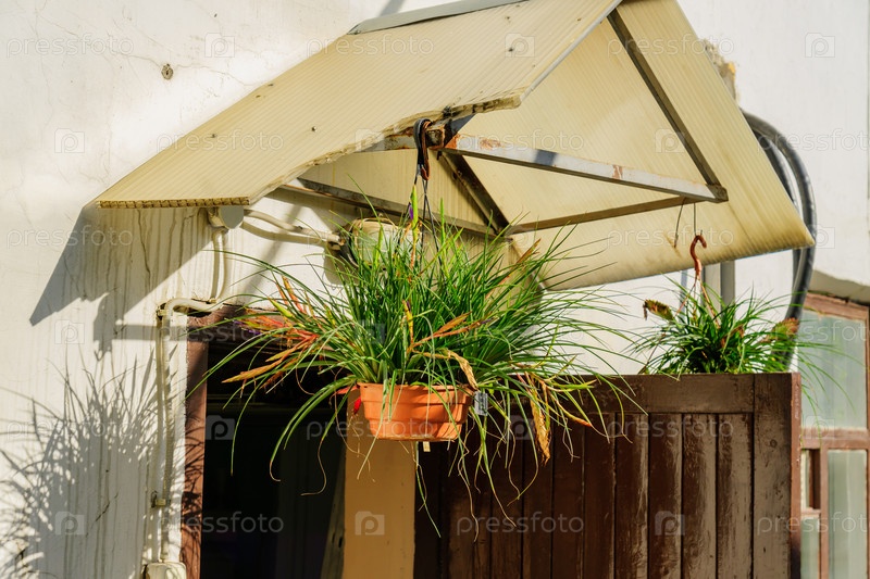 Вход в старый дом с крыльцом, украшенным цветами в подвесных горшках