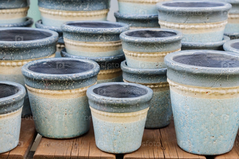 Множество пустых глиняных цветочных горшков для продажи. Украшение сада и интерьера