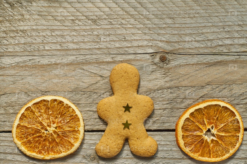 Вид сверху сушеных ломтиков апельсина и имбирного хлеба на деревянном фоне. Праздничная рождественская открытка с копией пространства для ваших проектов