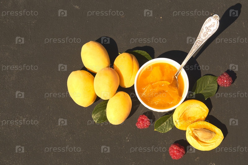 Домашнее органическое абрикосовое варенье в белой миске и спелые абрикосы на черном фоне. Жесткий свет