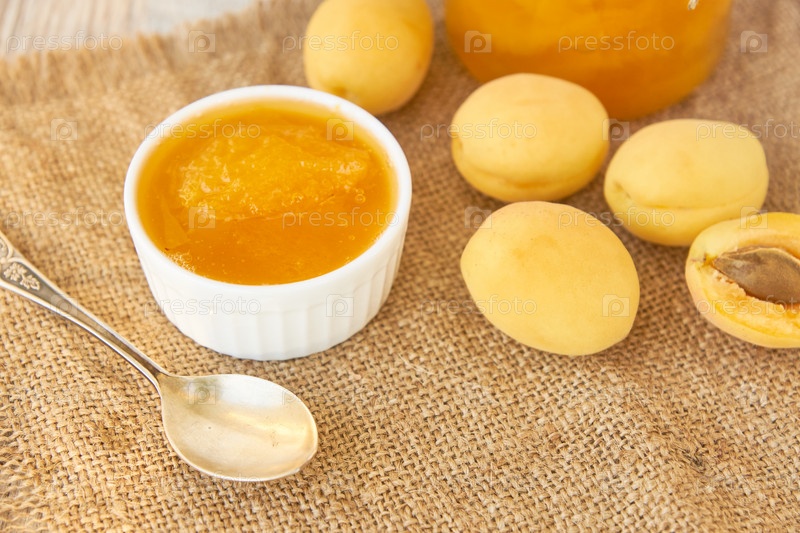 Домашнее органическое абрикосовое варенье в стеклянной банке и спелые абрикосы на деревянном деревенском столе