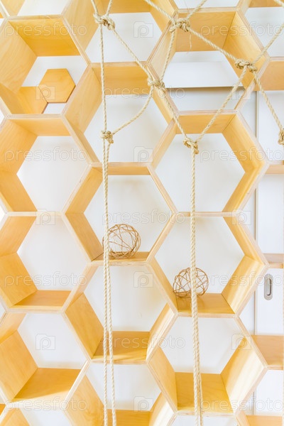 Фрагмент внутреннего убранства. Стена с деревянными сотовыми полками. Модный дизайн. Солнечные тени