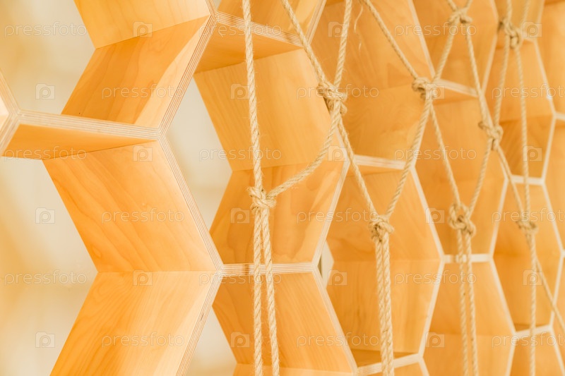 Фрагмент внутреннего убранства. Стена с деревянными сотами. Модный дизайн. Солнечные тени