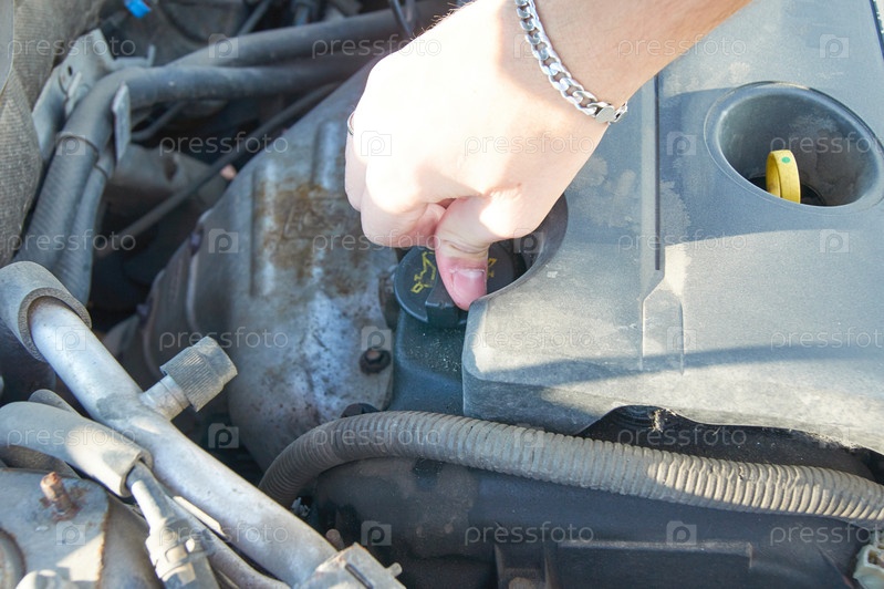 Механик проверяет и чинит крышку маслозаливной горловины сломанной машины в машине на дороге