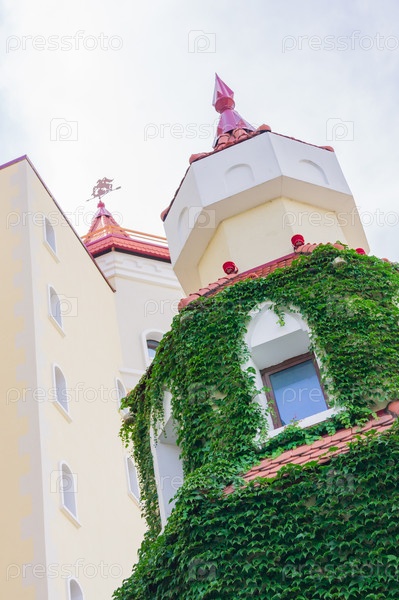 Адлер, Сочи, Россия - 07 сентября 2019 г.: Башня отеля в стиле средневекового замка Богатырь в Сочинском парке