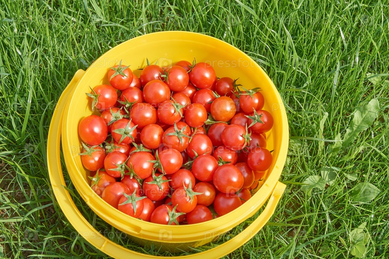 Свежий урожай помидоров черри в желтом пластиковом горшке на зеленой траве. Органическая еда