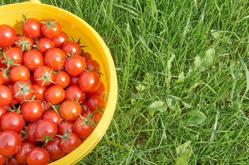 Свежий урожай помидоров черри в желтом пластиковом горшке на зеленой траве. Органическая еда