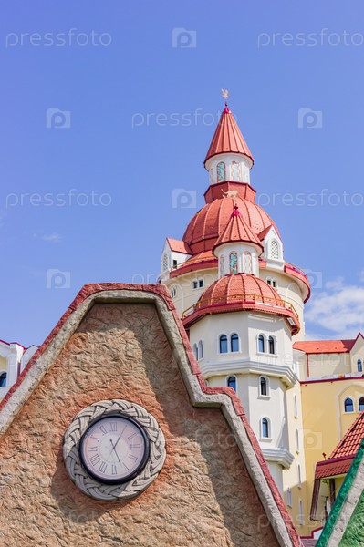 Адлер, Сочи, Россия - 07 сентября 2019 г.: Башня отеля в стиле средневекового замка Богатырь в Сочинском парке