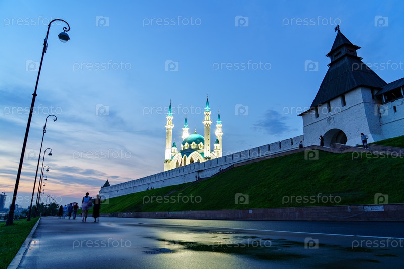 Казань, Россия. Мечеть Кул Шариф. Кремлевская стена. Преображенская башня Казанского кремля. Сумерки