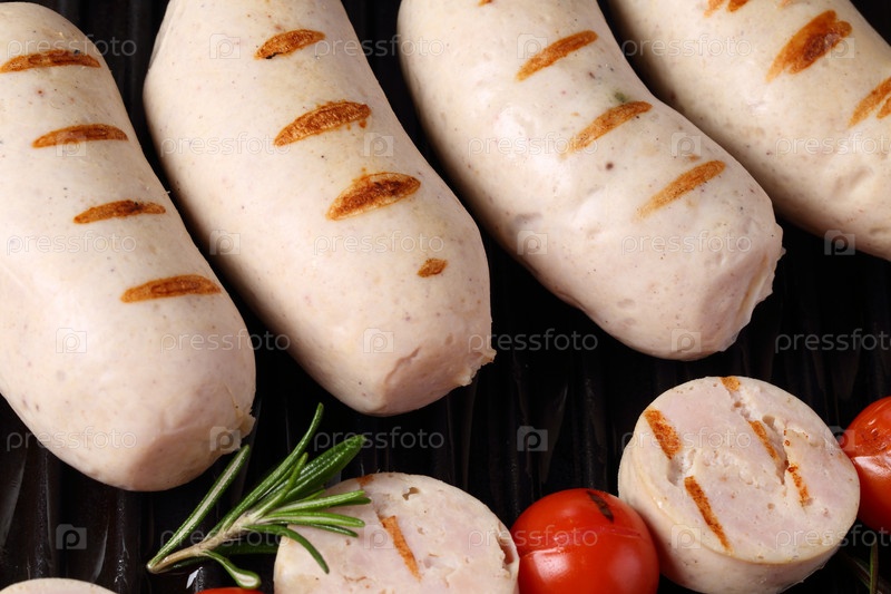 Купаты с овощами на деревянном фоне