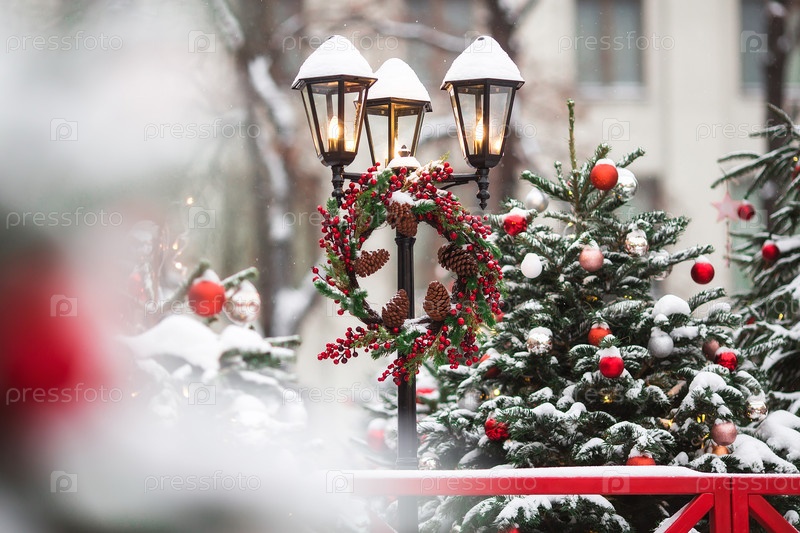 Новогоднее украшение улиц. в классических красно-зеленых тонах. Красивые праздничные пейзажи в городе. Украшенные елки