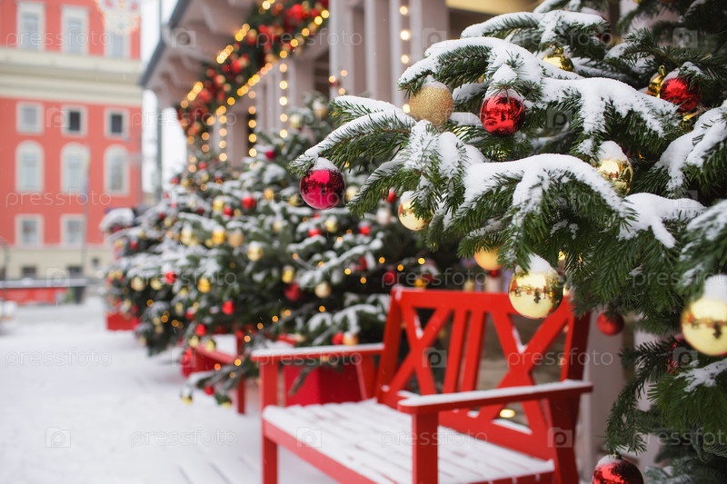 Новогоднее украшение улиц. в классических красно-зеленых тонах. Красивые праздничные пейзажи в городе. Украшенные елки