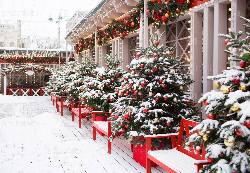 Новогоднее украшение улиц. в классических красно-зеленых тонах. Красивые праздничные пейзажи в городе. Украшенные елки