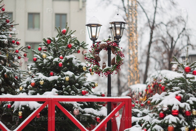 Новогоднее украшение улиц. в классических красно-зеленых тонах. Красивые праздничные пейзажи в городе. Украшенные елки