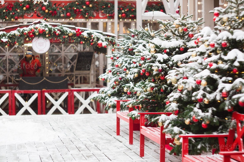 Новогоднее украшение улиц. в классических красно-зеленых тонах. Красивые праздничные пейзажи в городе. Украшенные елки