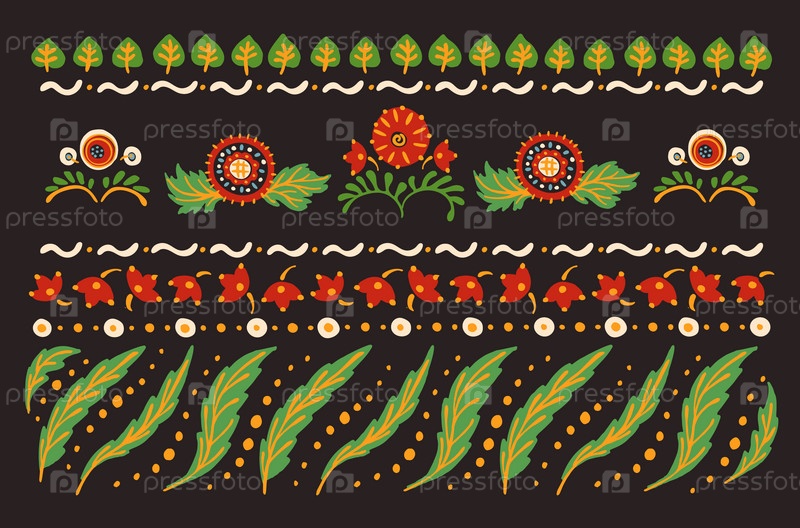 Набор этнических элементов. Бордюр представляет собой полосу с цветами, листьями, ветками, вензелями. Народная вышивка. Славянский, украинский, русский мотив. Хохлома, матрешка, дымковская игрушка. Мексиканский, индийский, цыганский ковер. Вязаное кружево
