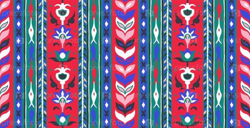 Геометрический дамасский орнамент. Икат границы. Этническая вышивка с листьями и монограммами. Племенная векторная текстура. Бесшовный народный узор в ацтекском стиле. Индийский, скандинавский, цыганский, мексиканский, африканский ковер