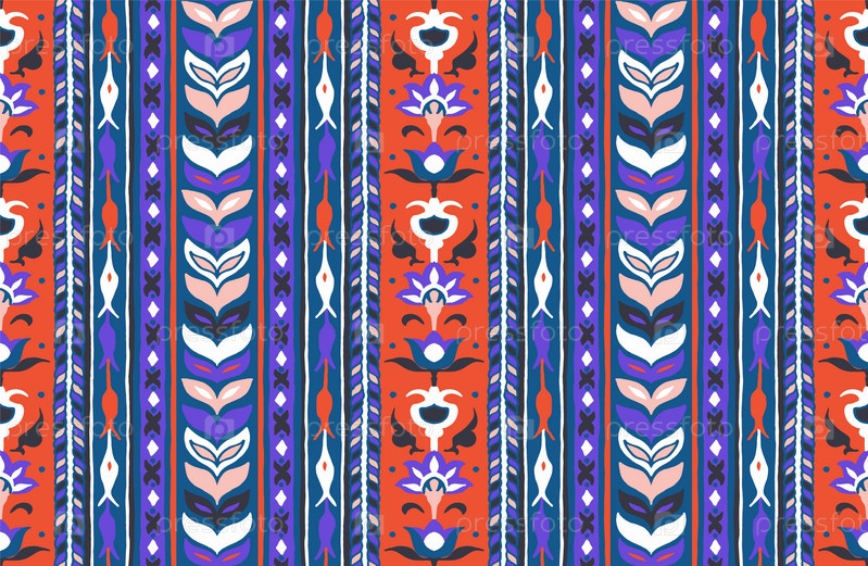 Геометрический дамасский орнамент. Икат границы. Этническая вышивка с листьями и монограммами. Племенная векторная текстура. Бесшовный народный узор в ацтекском стиле. Индийский, скандинавский, цыганский, мексиканский, африканский ковер