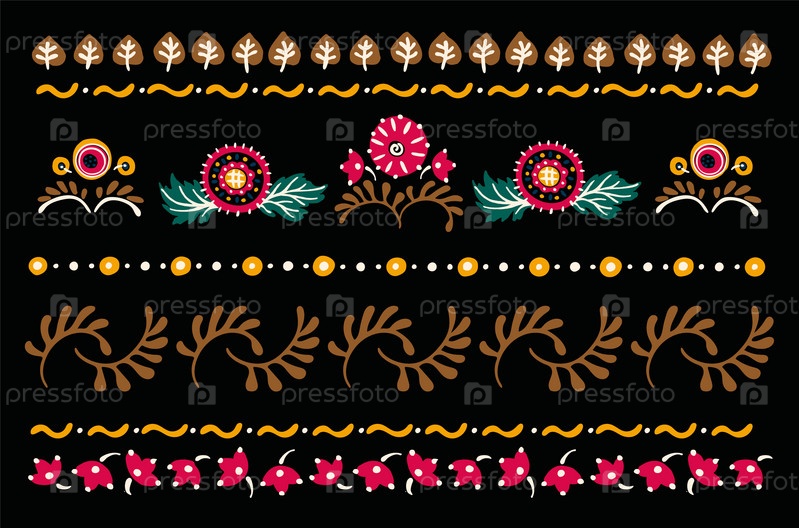 Набор этнических элементов. Бордюр представляет собой полосу с цветами, листьями, ветками, вензелями. Народная вышивка. Славянский, украинский, русский мотив. Хохлома, матрешка, дымковская игрушка. Мексиканский, индийский, цыганский ковер. Вязаное кружево