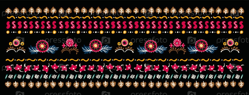 Набор этнических элементов. Бордюр представляет собой полосу с цветами, листьями, ветками, вензелями. Народная вышивка. Славянский, украинский, русский мотив. Хохлома, матрешка, дымковская игрушка. Мексиканский, индийский, цыганский ковер. Вязаное кружево