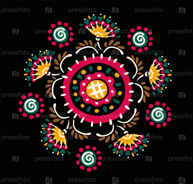 Набор этнических элементов. Бордюр представляет собой полосу с цветами, листьями, ветками, вензелями. Народная вышивка. Славянский, украинский, русский мотив. Хохлома, матрешка, дымковская игрушка. Мексиканский, индийский, цыганский ковер. Вязаное кружево