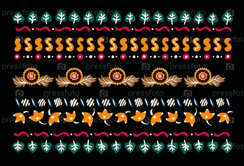 Набор этнических элементов. Бордюр представляет собой полосу с цветами, листьями, ветками, вензелями. Народная вышивка. Славянский, украинский, русский мотив. Хохлома, матрешка, дымковская игрушка. Мексиканский, индийский, цыганский ковер. Вязаное кружево