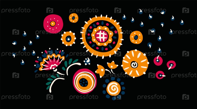 Набор этнических элементов. Бордюр представляет собой полосу с цветами, листьями, ветками, вензелями. Народная вышивка. Славянский, украинский, русский мотив. Хохлома, матрешка, дымковская игрушка. Мексиканский, индийский, цыганский ковер. Вязаное кружево