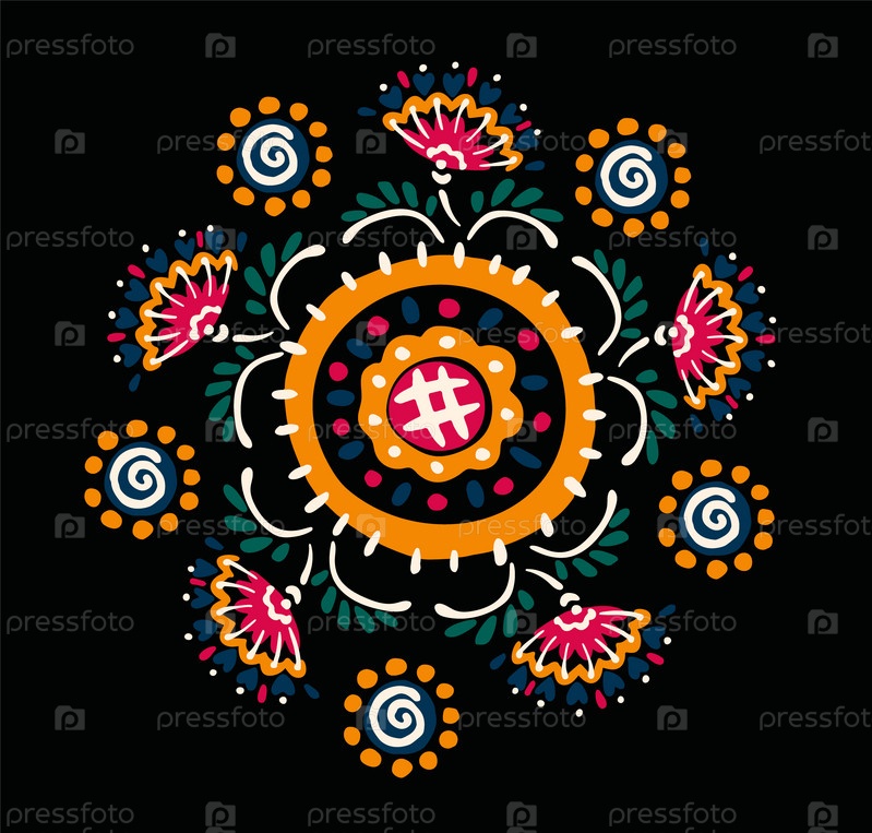 Набор этнических элементов. Бордюр представляет собой полосу с цветами, листьями, ветками, вензелями. Народная вышивка. Славянский, украинский, русский мотив. Хохлома, матрешка, дымковская игрушка. Мексиканский, индийский, цыганский ковер. Вязаное кружево