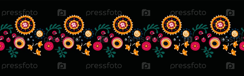 Набор этнических элементов. Бордюр представляет собой полосу с цветами, листьями, ветками, вензелями. Народная вышивка. Славянский, украинский, русский мотив. Хохлома, матрешка, дымковская игрушка. Мексиканский, индийский, цыганский ковер. Вязаное кружево