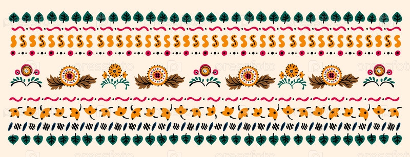 Набор этнических элементов. Бордюр представляет собой полосу с цветами, листьями, ветками, вензелями. Народная вышивка. Славянский, украинский, русский мотив. Хохлома, матрешка, дымковская игрушка. Мексиканский, индийский, цыганский ковер. Вязаное кружево