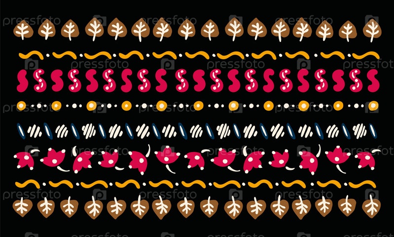 Набор этнических элементов. Бордюр представляет собой полосу с цветами, листьями, ветками, вензелями. Народная вышивка. Славянский, украинский, русский мотив. Хохлома, матрешка, дымковская игрушка. Мексиканский, индийский, цыганский ковер. Вязаное кружево