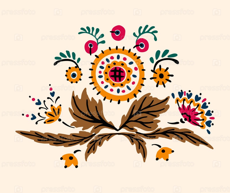 Набор этнических элементов. Бордюр представляет собой полосу с цветами, листьями, ветками, вензелями. Народная вышивка. Славянский, украинский, русский мотив. Хохлома, матрешка, дымковская игрушка. Мексиканский, индийский, цыганский ковер. Вязаное кружево