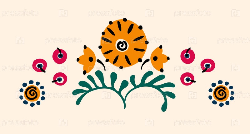 Набор этнических элементов. Бордюр представляет собой полосу с цветами, листьями, ветками, вензелями. Народная вышивка. Славянский, украинский, русский мотив. Хохлома, матрешка, дымковская игрушка. Мексиканский, индийский, цыганский ковер. Вязаное кружево