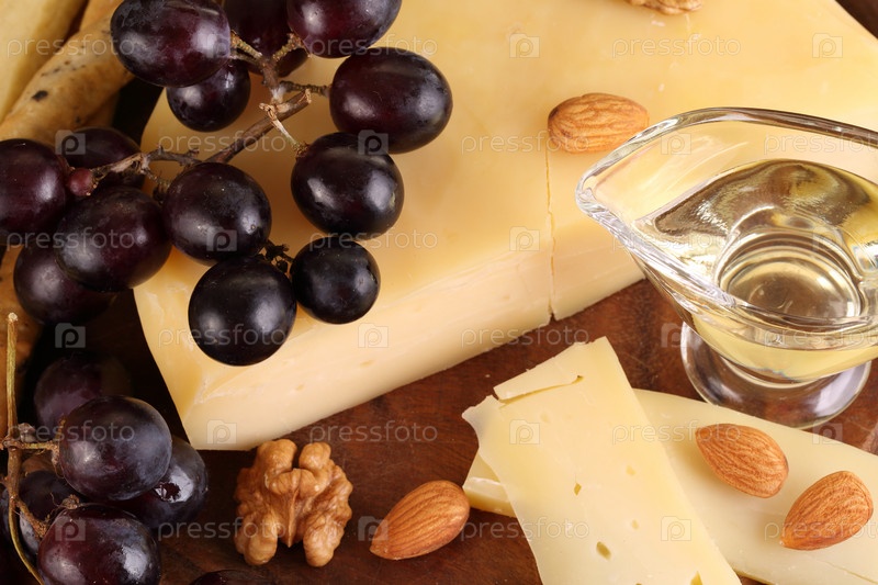 Сыр грюйер на деревянном столе с виноградом, орехами и оливковым маслом