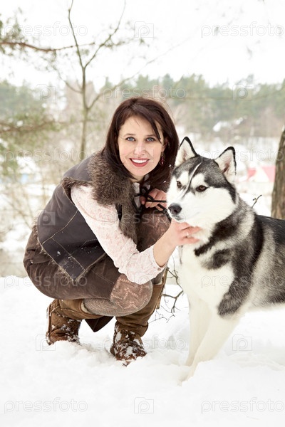 Счастливая девушка сидит с сибирским хаски