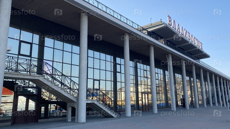 Владивосток, Россия, 8 мая 2022 г.: Городской пейзаж с видом на морской вокзал