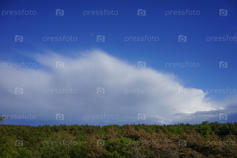 Огромное пушистое облако на фоне ярко-голубого неба и луны
