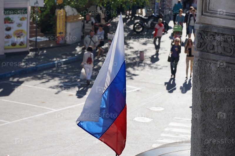 Российский флаг на фоне размытой улицы