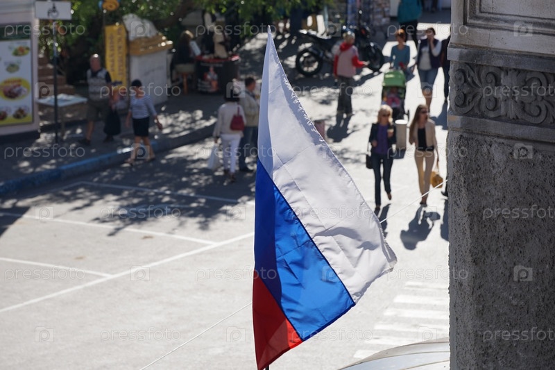 Российский флаг на фоне размытой улицы