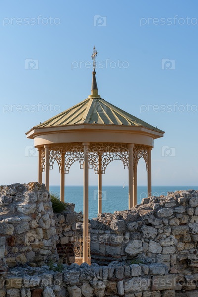 Желтая беседка среди руин Херсонеса на фоне синего моря. Севастополь, Крым