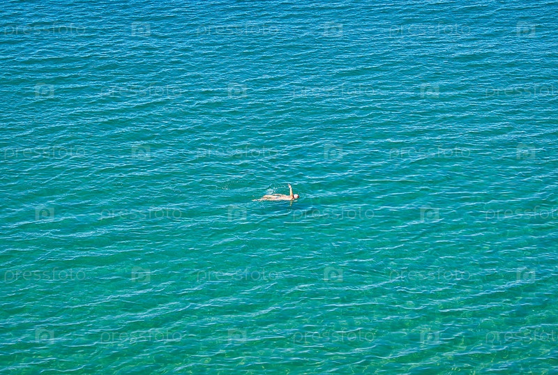 Морской пейзаж с миниатюрной фигуркой плывущего человека